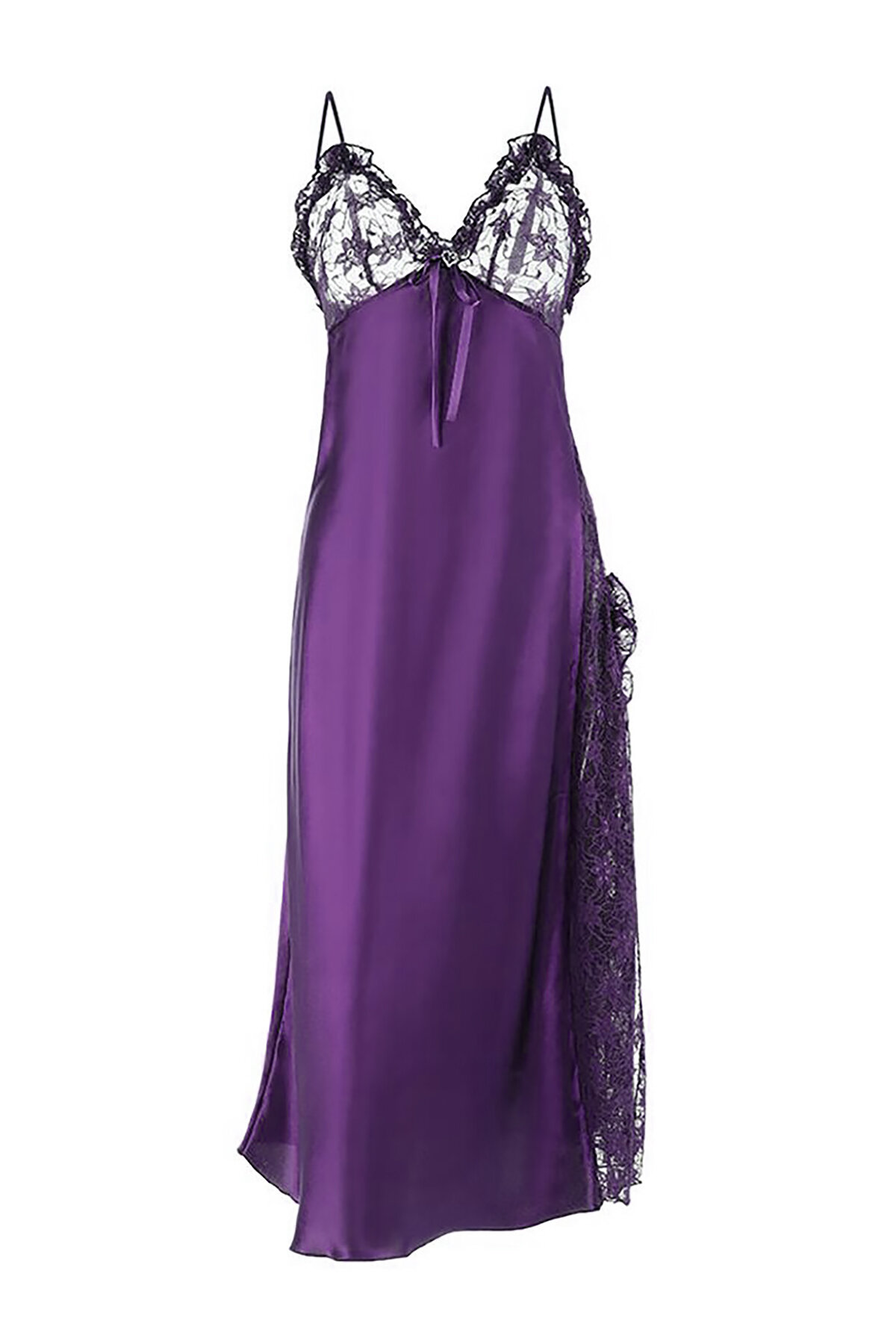 Mürdüm İp Askılı Dantel Detaylı Saten Tek Gecelik