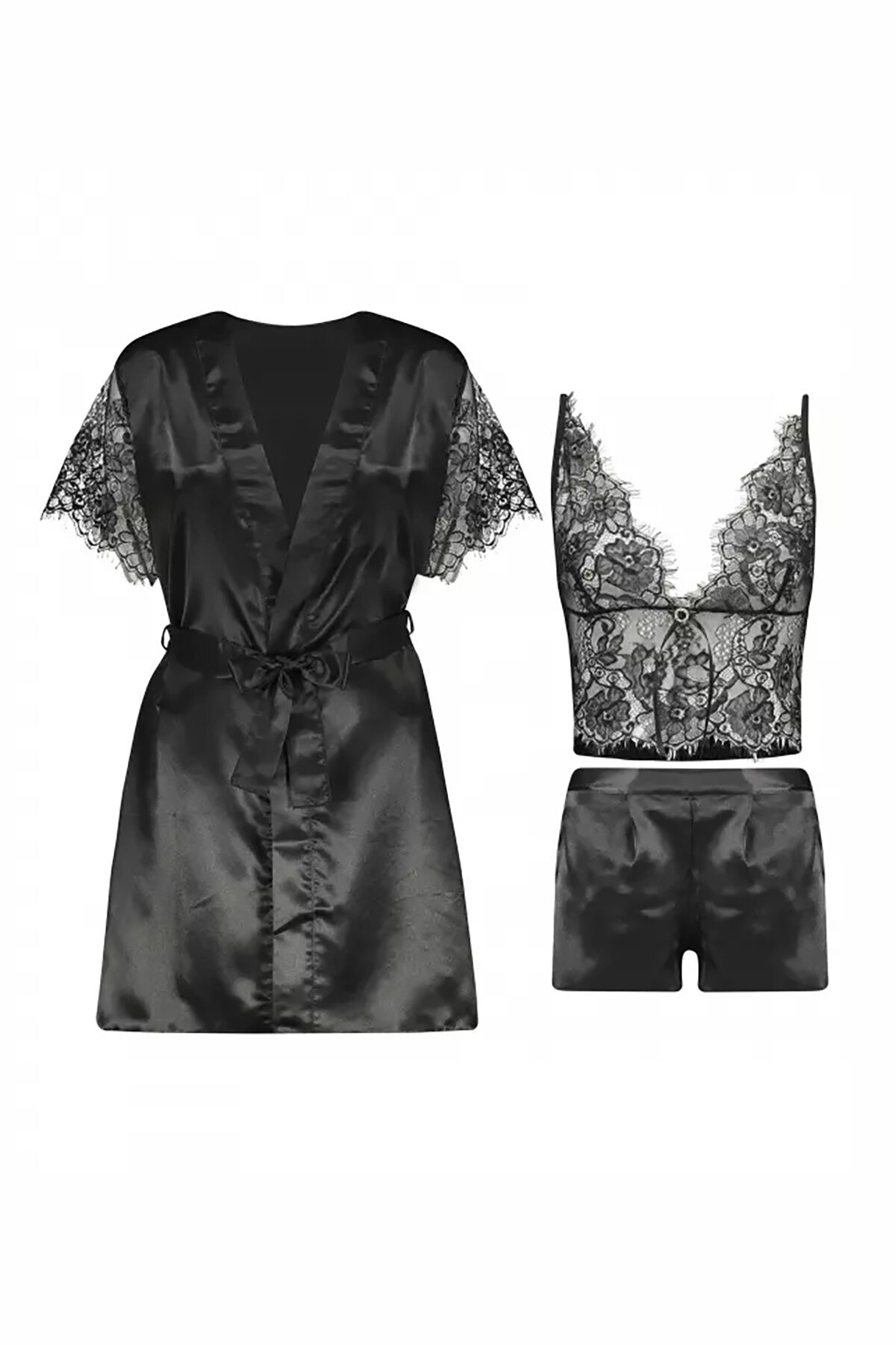Siyah Dantelli Saten Şortlu Sabahlık Takımı