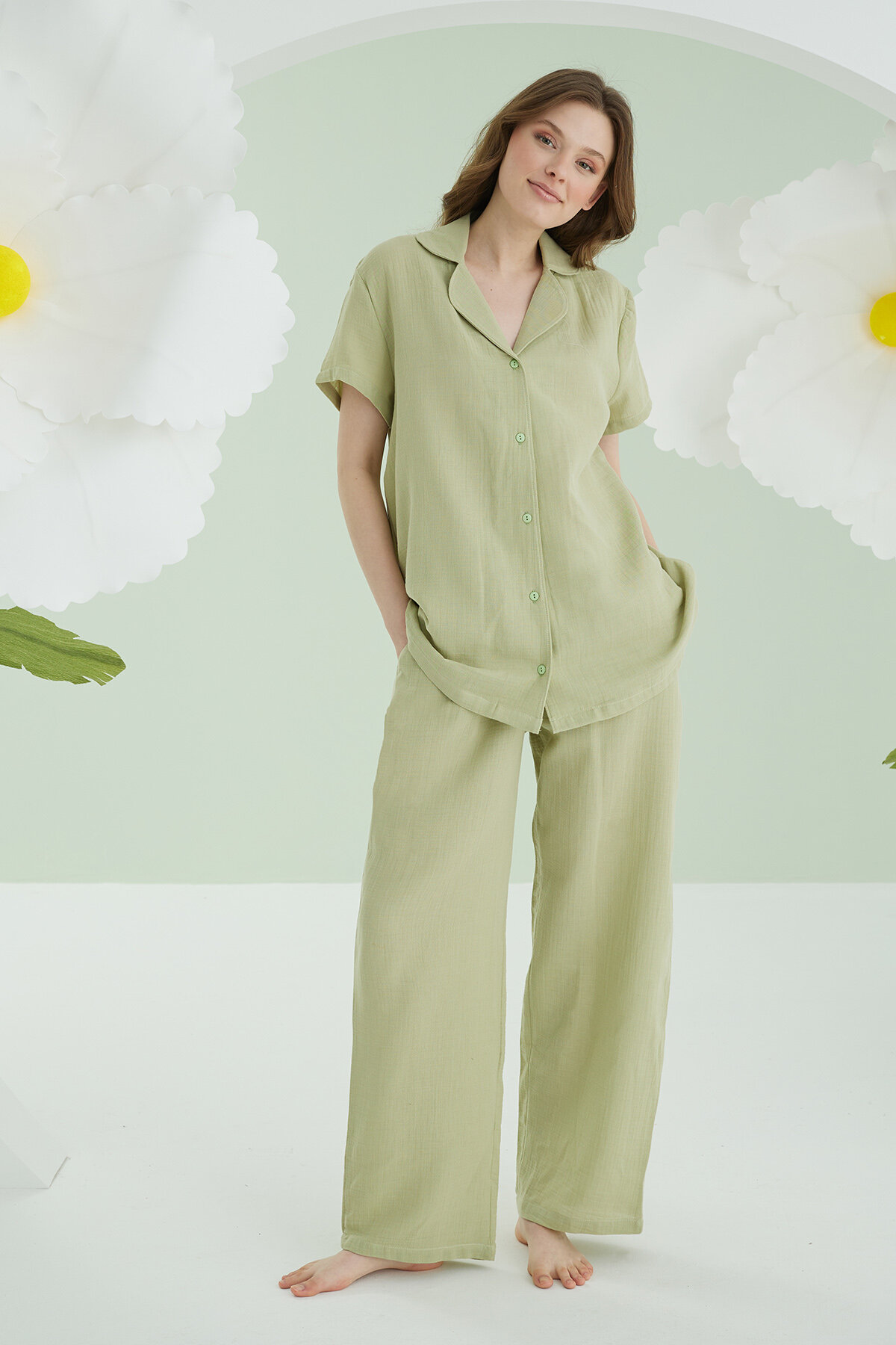 Kısa kollu, düğmeli üst tasarımı klasik ve zamansız bir görünüm sunarken, rahat kesim alt parçası hareket özgürlüğünü destekler. Yeşil rengi ile sade ve şık bir stil sunan bu takım, hem uyku hem de günlük ev giyimi için ideal bir seçenektir.